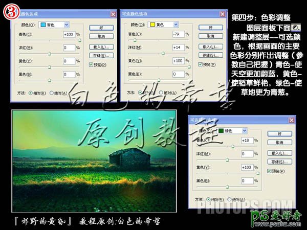 今天我们来学习一篇梦幻风景照调色教程,PS照片调色教程实例,photoshop调出一幅梦境田园风格的风景照特效,作者调色非常细心和专业。把一幅像素较差的手机照片处理成非常有诗情画意乡村图片。调色的时候作者把天空和地面部分分开来调,分别加强对