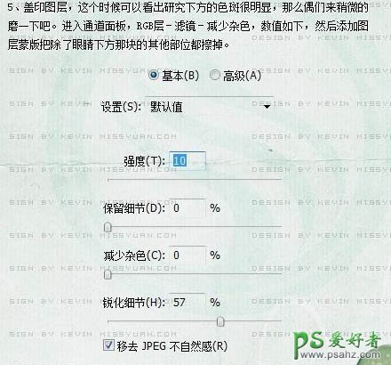 5、新建一个图层,按Ctrl + Alt + Shift + E 盖印图层。这个时候可以看出眼睛下方的色斑和明显,那么我们来稍微磨下吧。进入通道面板,选择RGB层,执行:滤镜 > 杂色 > 减少杂色,参数设置如下图。然后添加图层蒙版把除了眼睛下方的那块的其它部分都擦掉。