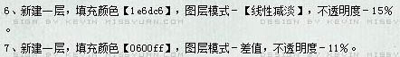 6、新建一个图层,填充颜色:#1e6dc6,图层混合模式改为“线性减淡”,不透明度改为:15%。 7、新建一个图层,填充颜色:#0600ff,图层混合模式改为“差值”,不透明度改为:11%。