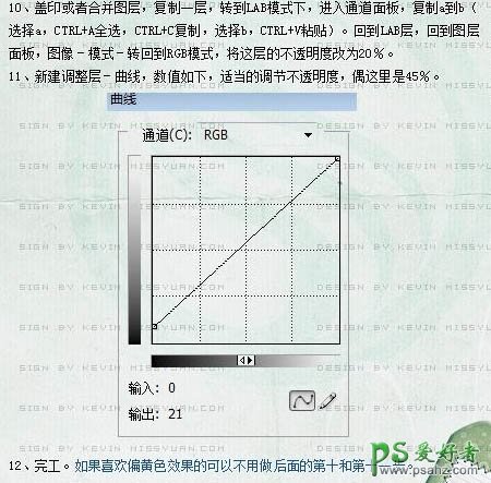 10、新建一个图层,盖印图层,复制一层。选择菜单:图像 > 模式 > Lab颜色,选择不合拼。进入通道面板,把a通道复制到b通道。回到图层面板,选择菜单:图像 > 模式 > RGB颜色,选择不合并,将这层的不透明度改为:20%。 11、创建曲线调整图层,参数设置如下图,确定后把图层不透明度改为:45%。
