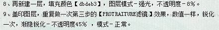 8、新建一个图层填充颜色:#dbdeb3,图层混合模式改为“强光”,不透明度改为:8%。 9、新建一个图层,盖印图层。再用Protraiture滤镜磨下皮,数值不变。再适当锐化一次,渐隐锐化不透明度改为:45%,模式为“正常”。