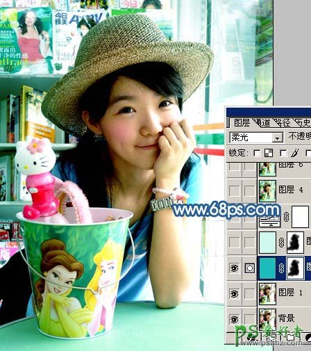 1、打开原图素材,新建一个图层,填充颜色:#1EBBBD,图层混合模式改为“柔光”,加上图层蒙版,用黑色画笔把人物部分擦出来,效果如下图。