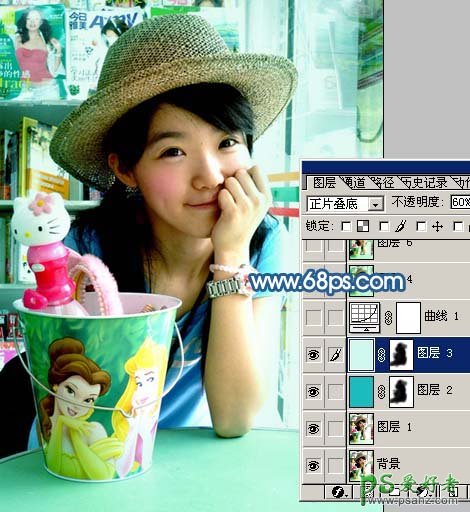 2、新建一个图层,填充颜色:#D0F7EC,把图层混合模式改为“正片叠底”,图层不透明度改为:60%,加上图层蒙版用黑色画笔把人物部分擦出来。