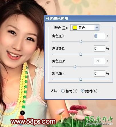 6、仍有点偏黄,选择可选色,点开黄,调低数值,因为减低数值不大,对佛珠黄影响不大。(提示:rgb和lab调色的差别也在这)