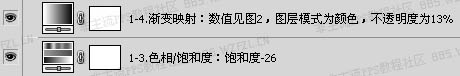 3、创建色相/饱和度调整图层,把饱和度数值设置为:-26。 4、创建渐变映射调整图层,参数设置如下图,确定后把图层混合模式改为“颜色”,图层不透明度改为:13%。