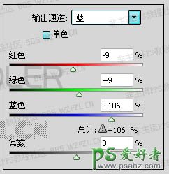 5、创建通道混合器调整图层,对蓝色进行调整,数值为:-9/+9/+106。