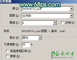 6、新建一个图层,盖印图层。选择菜单:图像 > 模式 > Lab颜色。选择不合拼。执行:图像 > 应用图像,参数设置如图11。