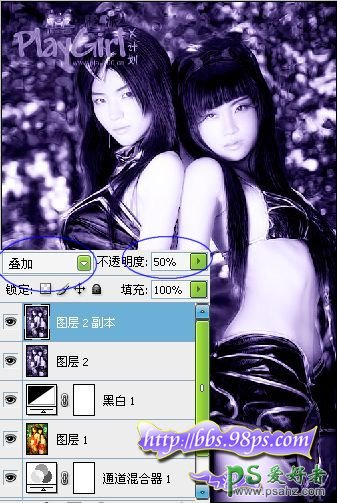 8、将图层混合模式设置为叠加,不透明度改为50%,完成最终效果。