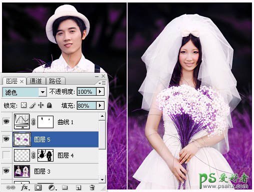6、最后用曲线拉亮整个画面,再建一新图层,在俩束花上涂上紫色,把混合模式设为滤色,如图: