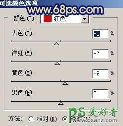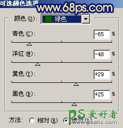 2、创建可选颜色调整图层,对红色及绿色进行调整,参数设置如图5,6,效果如图7。