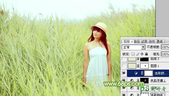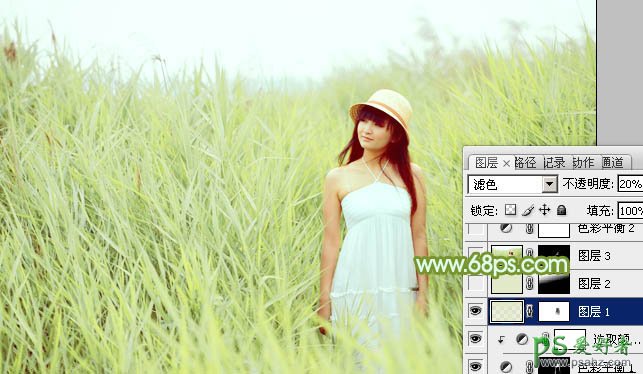 8、按Ctrl + Alt + 2 调出高光选区,新建一个图层填充淡绿色:#E2E9C8,混合模式改为“滤色”,不透明度改为:20%,添加图层蒙版,用黑色画笔把人物脸部擦出来,效果如下图。这一步增加图片高光部分的亮度。
