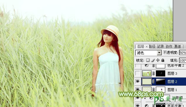 9、新建一个图层填充淡绿色:#E2E9C8,混合模式改为“滤色”,不透明度改为:50%,按住Alt键添加图层蒙版,用白色画笔把左上角部分擦出来,效果如下图。这一步给图片增加高光。
