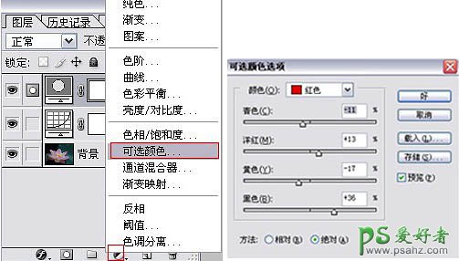 2、然后对图片的色彩进行调整,可选颜色调整图层,分别对图片的红(花瓣),黄(花蕊),绿(叶子)进行混合。 (很多人都习惯用色相/饱和度,ctrl+M的曲线来调整图片,但其实使用这个工具在调色时可以对各种颜色进行混合,并可以控制每种颜色的黑色成份,有助于使花瓣看上去更透亮。)