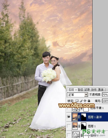 今天我们来学习一篇PS婚片调色实例教程,photoshop调出柔美的霞光情侣婚纱照特效,泛白的图片增加天空是常用的美图方法。过程也很简单,只需要把天空部分加到图片泛白的天空部分,适当用蒙版等控制好范围,后期渲染一下颜色即可。 最终效果 原图