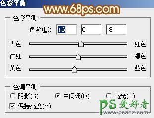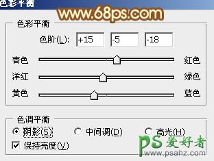 8、创建色彩平衡调整图层,对阴影、中间调、高光进行调整,参数设置如图17 - 19,效果如图20。这一步给图片增加橙黄色。