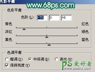 3、创建色彩平衡调整图层,参数设置如图9,确定后用黑色画笔把人物部分擦出来,图层不透明度改为:60%,效果如图10。