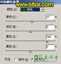 2、创建可选颜色调整图层,对绿色进行调整,参数设置如图2,效果如图3。
