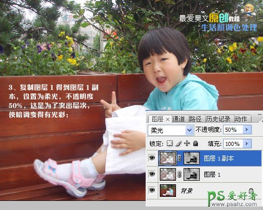 3、把图层1复制一层,得到图层1副本,图层混合模式改为“柔光”,不透明度改为:50%,这一步操作为了突出图片的层次感,使暗调变得有光彩。
