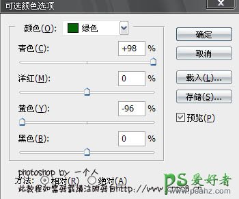 6、接着再创建一个“可选颜色”调整图层,在绿颜色下将参数设为+98、0、-96、0,方法使用相对。