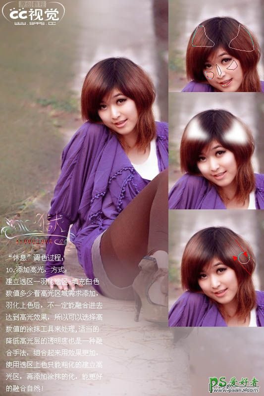 10、新建一个图层,在头发部分建立一个选区,适当羽化后填充白色,适当降低图层不透明度,然后选择涂抹工具涂抹,效果如下图。