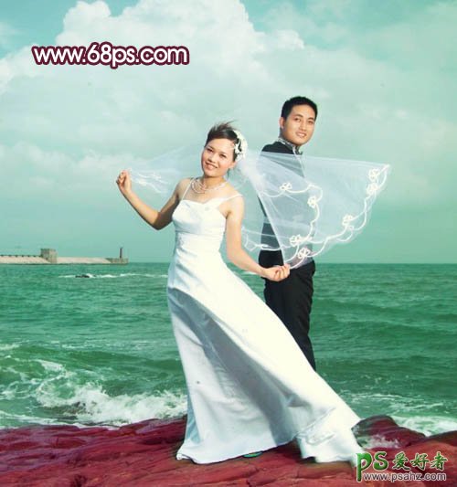 photoshop调出青绿色海景婚纱艺术照