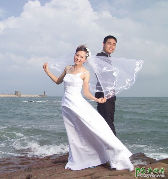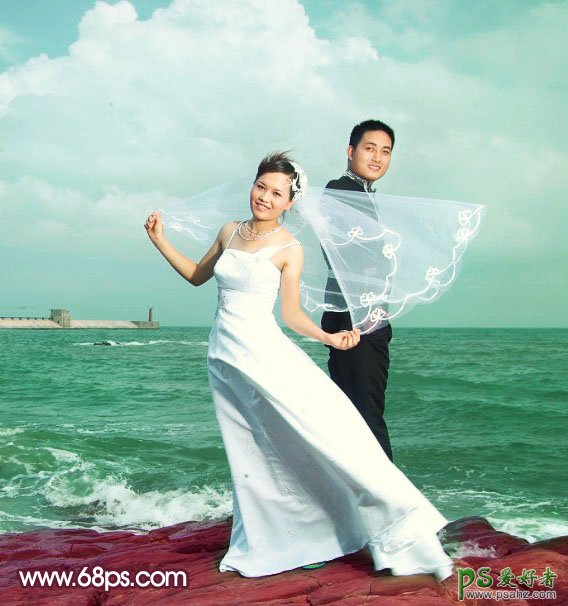 PS婚片调色实例教程,photoshop调出青绿色海景婚纱艺术照,本教程简单介绍低像素的婚片调色。由于像素不高,人物及服饰部分不需要精细的处理。只要调色即可,色彩可以根据自己的喜好选择。