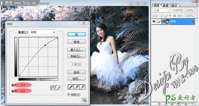 7、用选区选出人物脸部,并按Ctrl+Alt+D羽化(羽化值:100),然后按Ctrl+M调整曲线(输入:173、输出:205)效果如图所示。
