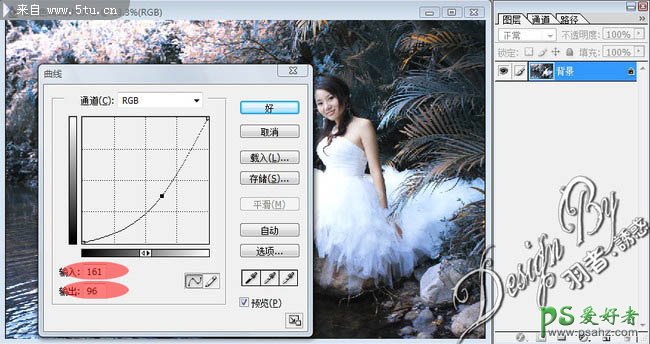 8、用套索工具选出左下角湖水的部分,按Ctrl+Alt+D羽化(羽化值:100),然后按Ctrl+M调整曲线(输入:161、输出:96)。