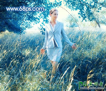 9、新建一个图层,盖印图层。用套索工具选出图17所示的选区,按Ctrl + Alt + D 羽化50个像素后,按Ctrl + J 复制到新的图层,图层混合模式改为“滤色”,图层不透明度改为:20%,加上图层蒙版,用黑色画笔把人物部分擦出来,效果如图18。