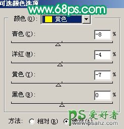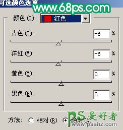 2、创建可选颜色调整图层,对红色及黄色进行调整,参数设置如图6,7,效果如图8。