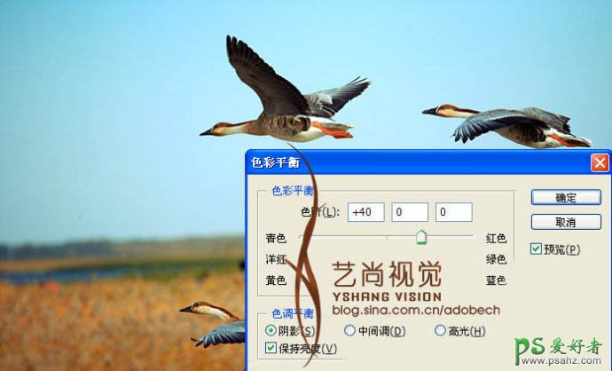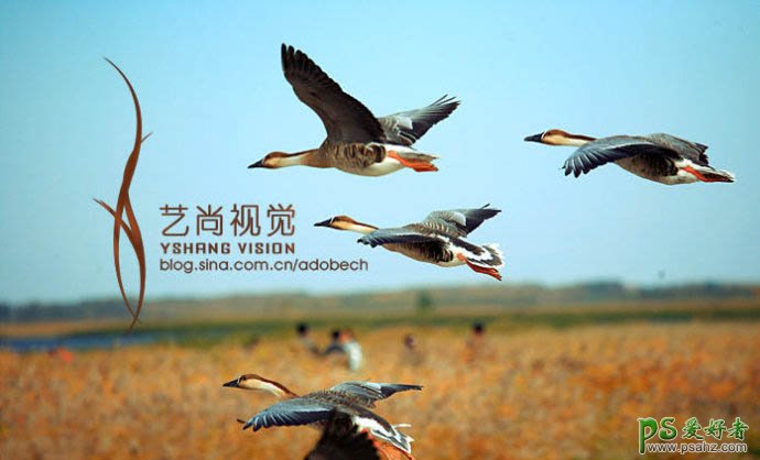 PS特效照片调色教程实例,photoshop调出艺术视觉效果的大雁起飞图片,本教程的色彩搭配的非常经典。天空背景部分为淡冷的青色调。地面部分为橙红的暖色调。两种颜色过渡的非常自然,看上去清爽,舒服。调色方法也比较简单,用可选颜色,色彩平衡等