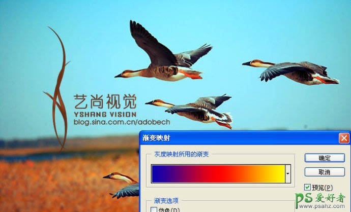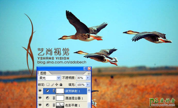 PS特效照片调色教程实例,photoshop调出艺术视觉效果的大雁起飞图片,本教程的色彩搭配的非常经典。天空背景部分为淡冷的青色调。地面部分为橙红的暖色调。两种颜色过渡的非常自然,看上去清爽,舒服。调色方法也比较简单,用可选颜色,色彩平衡等