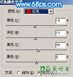 3、创建可选颜色调整图层,参数设置如图6,效果如图7。
