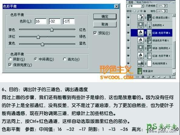 6、按Ctrl + Alt + 1 调出红色通道高光选区,创建色彩平衡调整图层,数值:中间调:16/-32/-17;阴影:1/-13/-26;高光:-53/-22/-30。