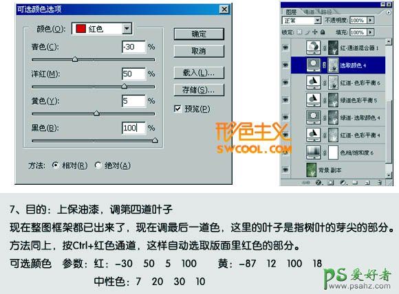 7、按Ctrl + Alt + 1 调出红色通道高光选区,创建可选颜色调整图层,数值:红:-30/50/5/100;黄:-87/12/100/18;中性色:7/20/30/10。