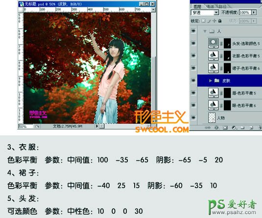 9、用钢笔勾出上衣部分的路径,转为选区后创建色彩平衡调整图层,数值:中间调:100/-35/-65;阴影:-65/-5/20。 10、用钢笔勾出裙子部分的选区,创建色彩平衡调整图层,数值:中间调:-40/25/15;阴影:-60/-35/10。 11、用钢笔勾出头发部分选区,创建可选颜色调整图层,数值:中性色:10/0/030。