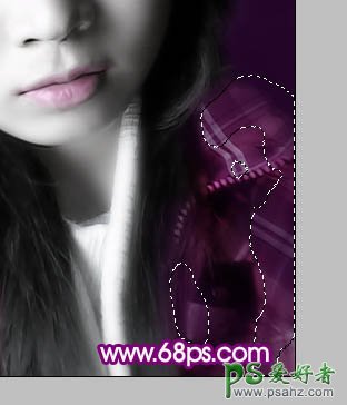 15、衣服部分感觉有点太鲜艳了。新建一个图层,把前景颜色设置为:#24052A,用画笔把图19所示的部分涂色,效果如图20。