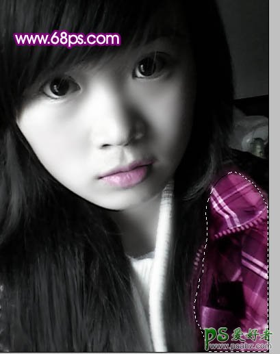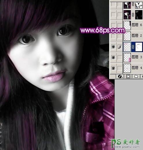 7、新建一个图层,图层混合模式改为“叠加”,把前景颜色设置为:#C80B90。选择画笔工具,画笔不透明度设为:10%左右。然后稍微把人物头发部分涂点紫色,如下图。