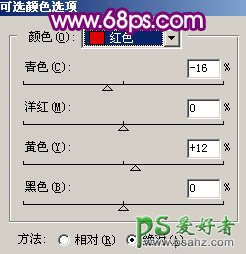 14、创建可选颜色调整图层,对红色进行调整,参数设置如图17,效果如图18。