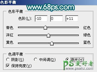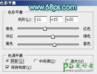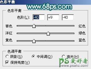 5、创建色彩平衡调整图层,参数设置如图7,8,9。确定后用黑色画笔把人物脸部擦出来。如果觉得色彩还不够浓,可以把当前色彩平衡调整图层复制一层,适当降低图层不透明度,大致效果如图10。