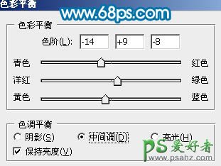 8、创建色彩平衡调整图层,参数设置如图19,效果如图20。