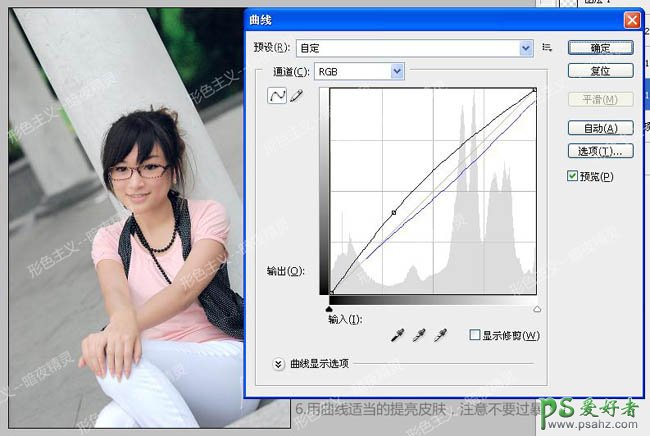 6,7、创建曲线调整图层,对全图及蓝色进行调整,目的是提亮皮肤。参数及效果如下图。