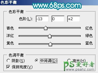 4、创建色彩平衡调整图层,参数设置如图9,效果如图10。