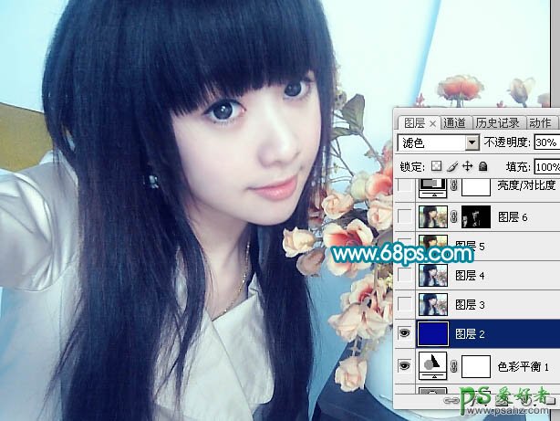 5、新建一个图层,填充颜色:#050B98,图层混合模式改为“滤色”,图层不透明度改为:30%,效果如下图。