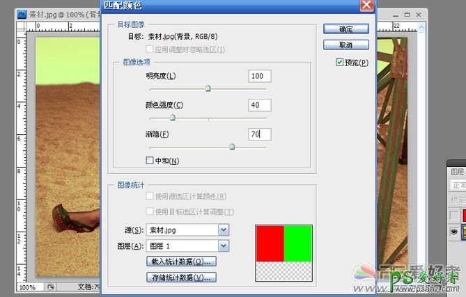5、菜单栏“图像——调整——匹配颜色”,设置数值参考下图。