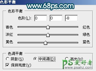 1、打开原图素材,创建色彩平衡调整图层,参数设置如图1,效果如图2。