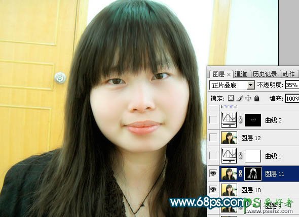 10、新建一个图层盖印图层。图层混合模式改为“正片叠底”,图层不透明度改为:35%,按住Alt 键添加图层蒙版,用白色画笔把人物头发部分擦出来,如下图。