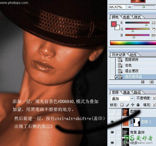 2、新建一个图层,填充颜色:#D06840,图层混合模式改为“叠加”。加上图层蒙版,用黑色画笔把皮肤以外的部分擦掉。然后新建一个图层,按Ctrl + Alt + Shift + E 盖印图层。