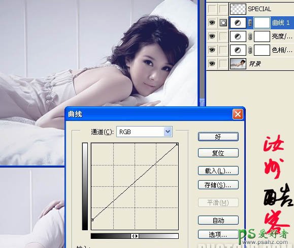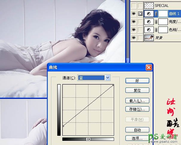 PS美女照片调色实例教程,photoshop调出墨蓝色性感美女床上艺术照,本教程的调色过程比较简单,不过色调非常经典。调色的方法也比较简单:调色之前先降低图像的饱和度,再适当给人物磨皮及美白。最后用曲线调成蓝色即可。 最终效果 原图 1、