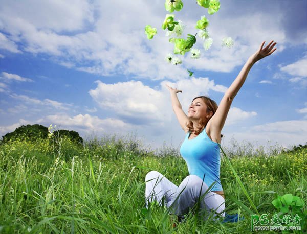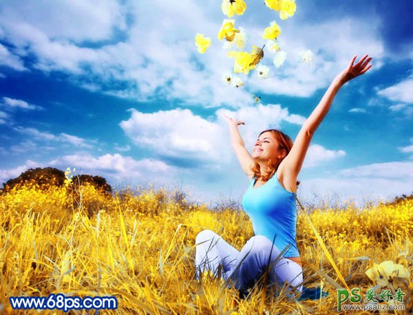 PS美女照片调色实例教程,photoshop调出景秋大胸美女田野照片,原图素材本身色彩比较少。仅绿的草地和蓝色的天空,色调已经分开。因此调色比较简单,用调色工具稍微把草地的颜色调成橙色,再适当调整下整体颜色即可。